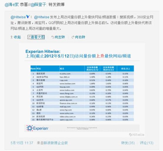 (创想商务)5月25日消息,昨日,著名天使投资人薛蛮子在新浪微博中转发了一条关于Experian Hitwise发布的周访问量份额上升最快的网站/频道排名的数据。该数据显示,除知名品牌网站搜狐视频等外,电商新秀海e家也荣登榜上。