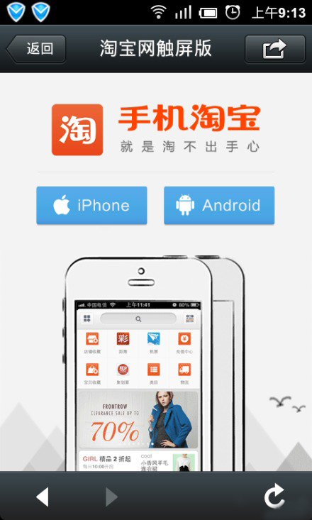 (创想资讯)11月22日晚间消息,继微信封杀来往链接以后,手机淘宝也进行了对微信的屏蔽:手机淘宝已经关闭了从微信跳转到淘宝商品和店铺的通道,从微信的淘宝商品以及店铺的链接点击进入,会跳转到手机淘宝的下载安装页面。